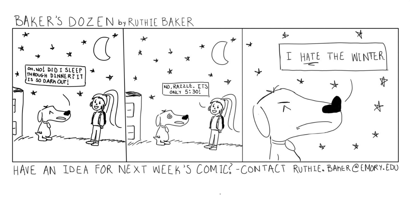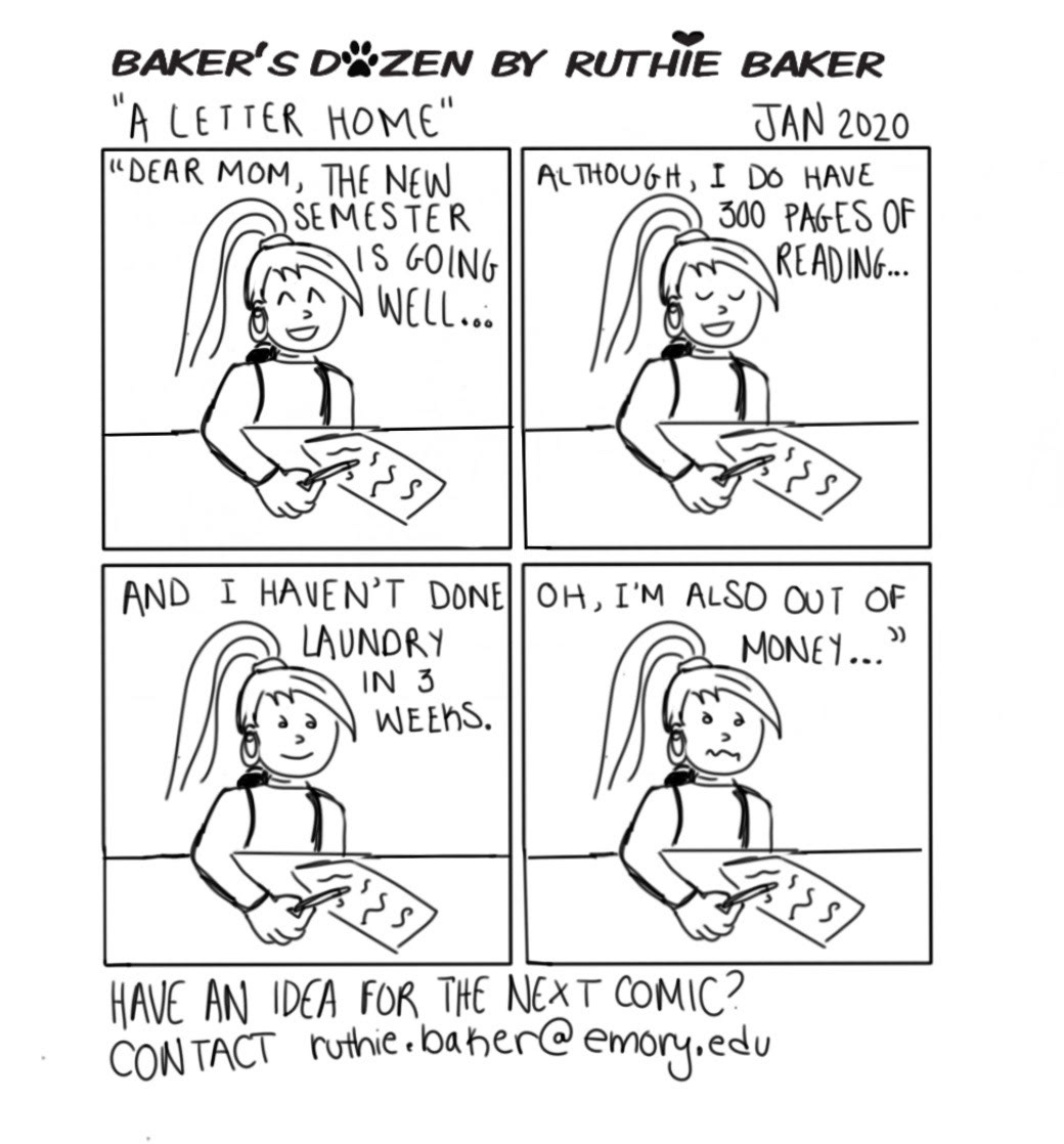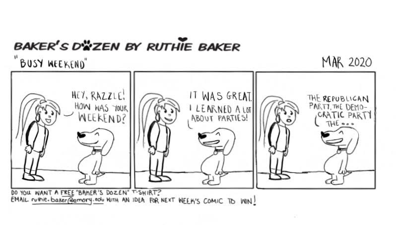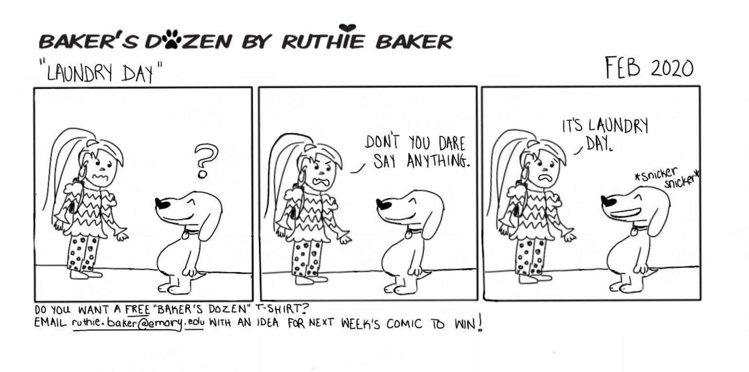 Selections from the Baker's Dozen comic strip written for the Emory University Wheel Newspaper. 2020-2021.