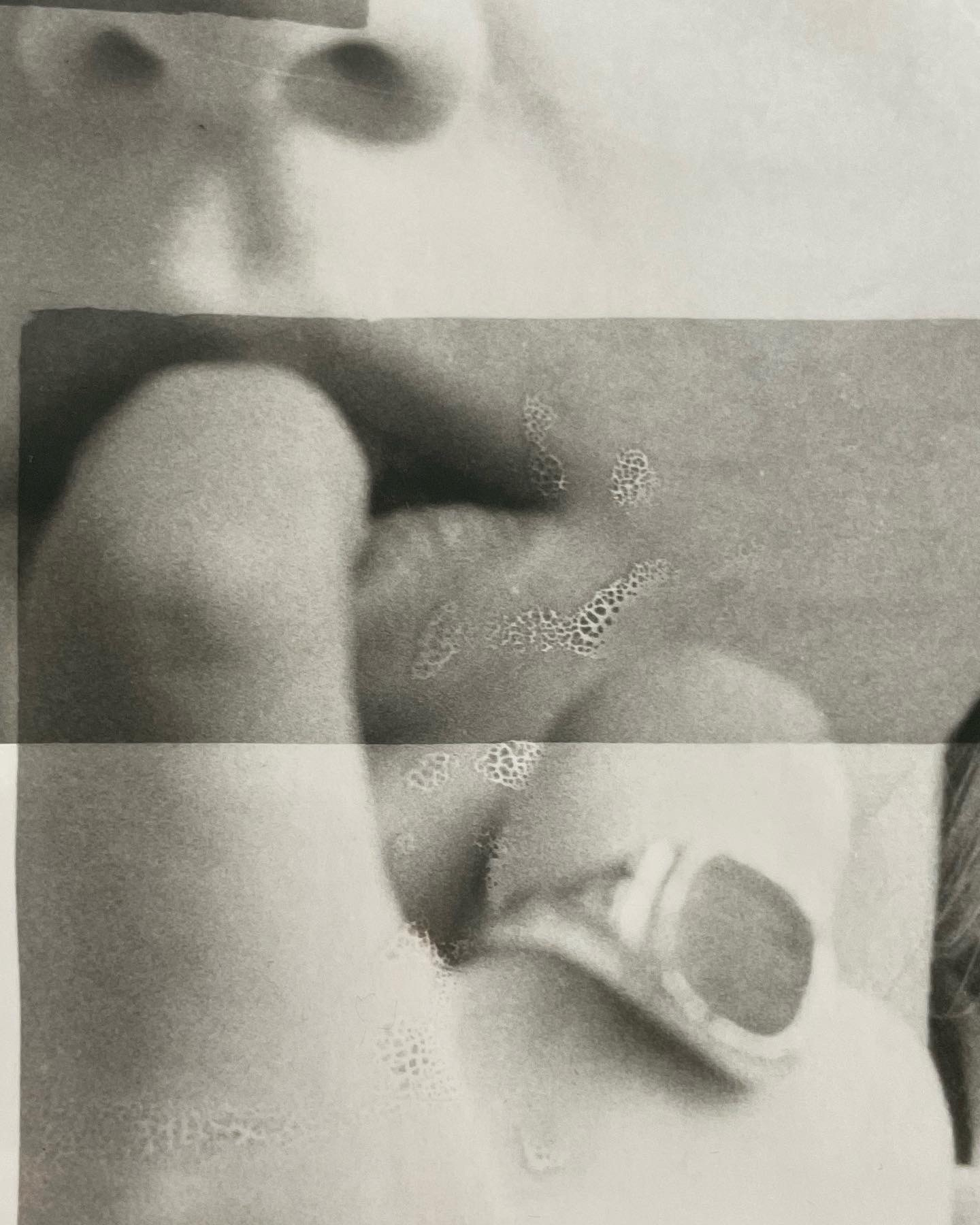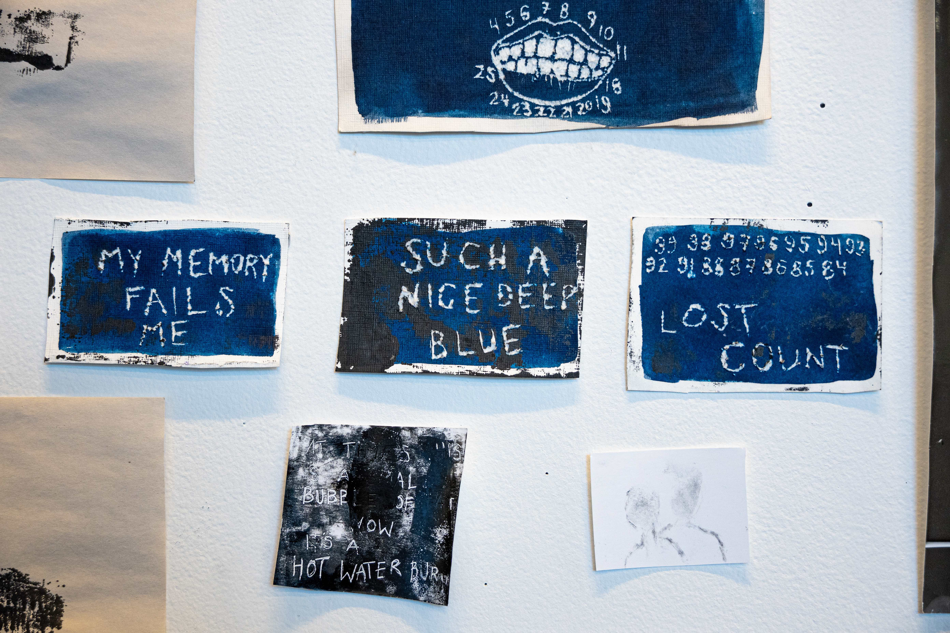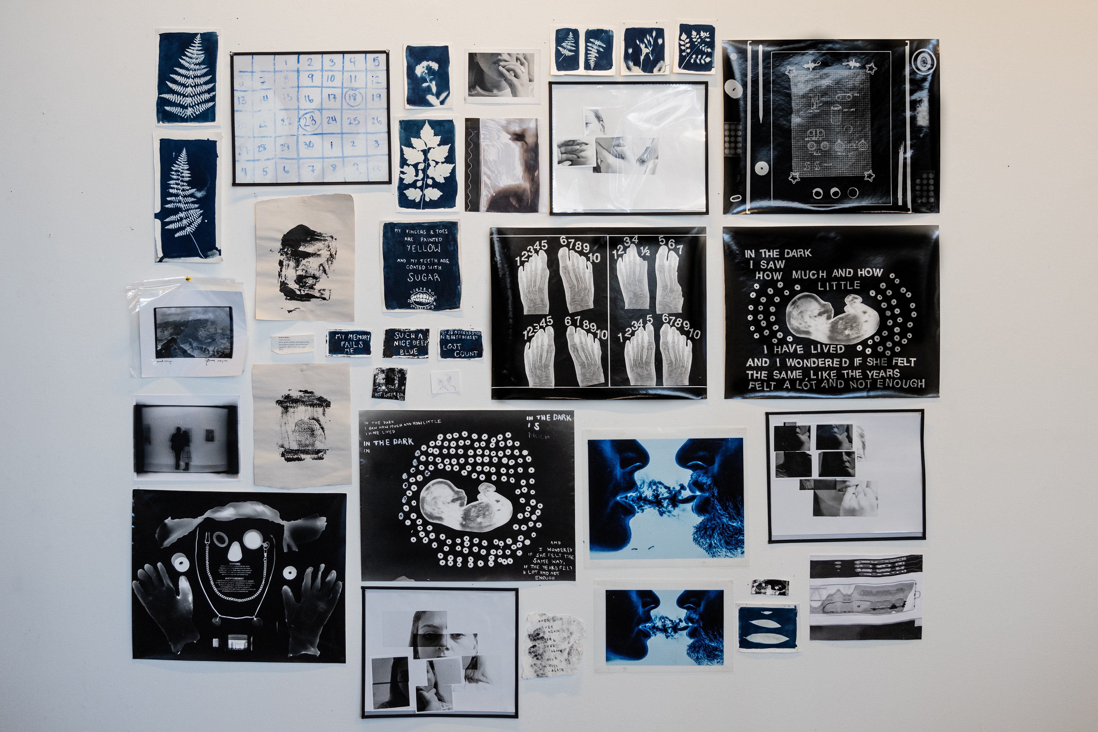 An unusual self-portrait comprised of cyanotypes, photograms, xerographs, and inky images on newsprint. 2022.