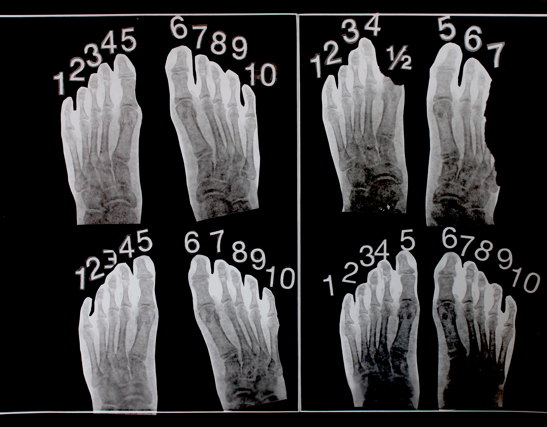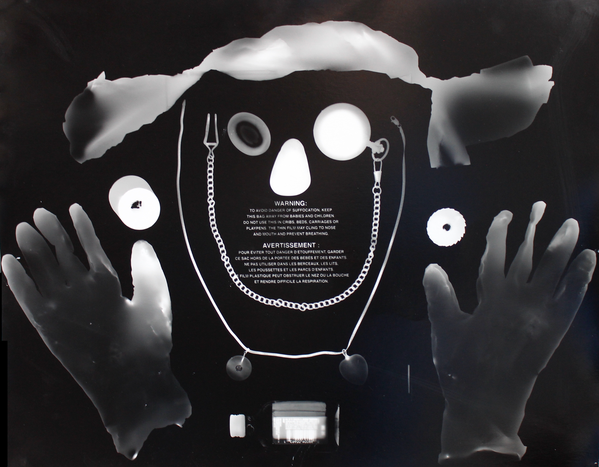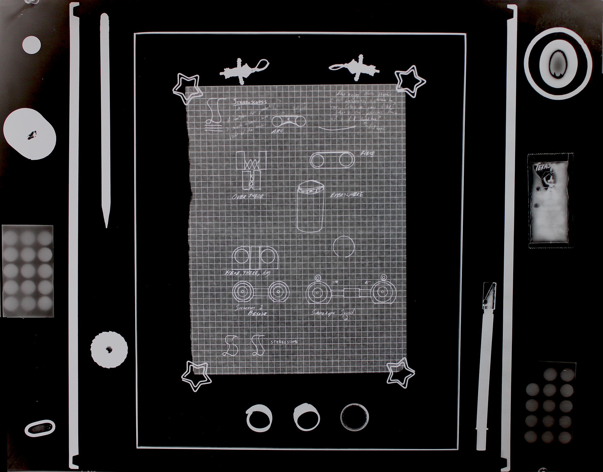 A series of photograms (made by placing collage elements and material objects onto light sensitive photographic paper). 16 x 20 gelatin silver prints, 2022.
