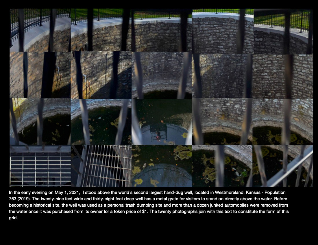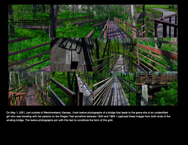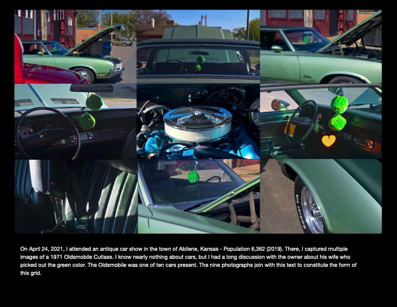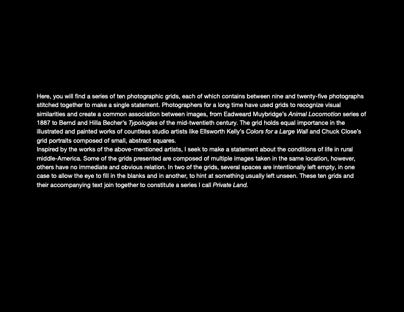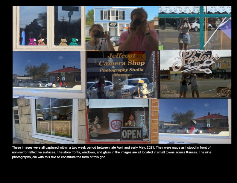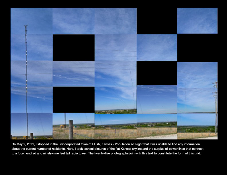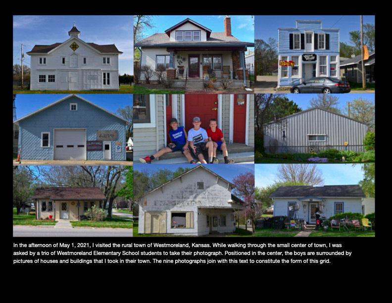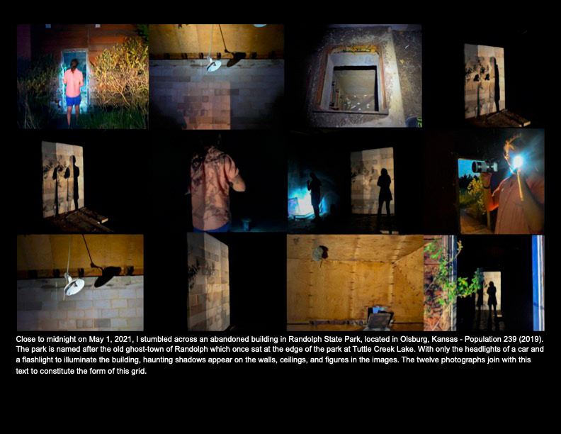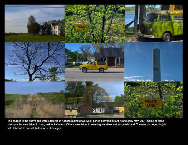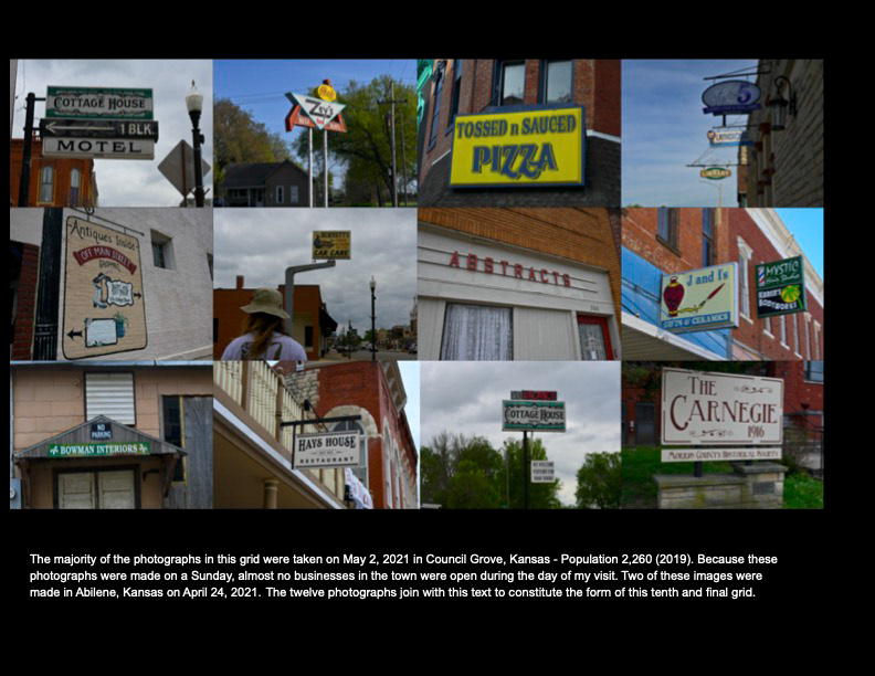 A series of ten grids and their accompanying text about the conditions of life in rural and abandoned areas of Kansas. Digital photographs, 2021.